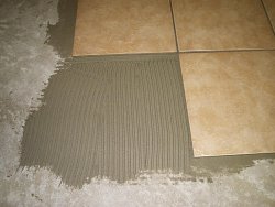 La pose de tuiles de céramique se fait à l’aide d’une colle à tuile qui est appliquée à l’aide d’une truelle à poser la céramique .