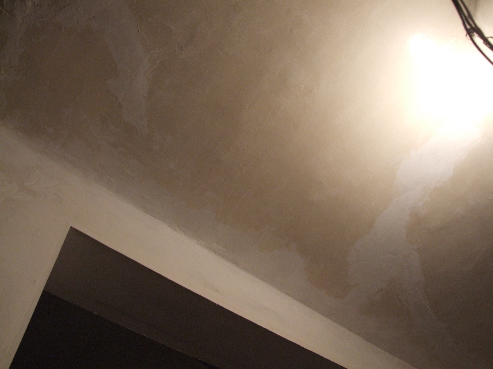 – par collage sous plafond d’une bande résiliante de liège ( de largeur égale à l’épaisseur du carreau utilisé). L’interstice entre la bande résiliante et le haut de la cloison sera comblé par un mélange constitué à 50% de colle à carreau et 50% de plâtre. Après durcissement ( 15 à 30 minutes environ), l’excédent sera gratté à la lisseuse en suivant la face du carreau. La finition sera réalisée par la pose d’une bande à cueillie.
